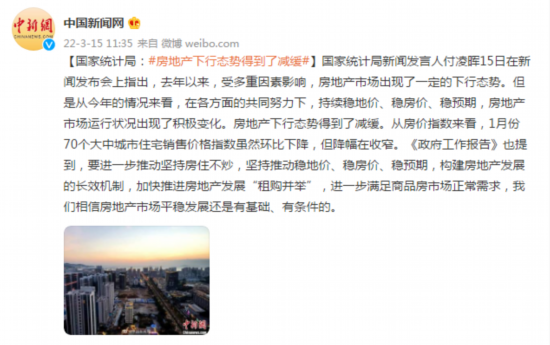 【国家统计局:#房地产下行态势得到了减缓#】国家统计局新闻发言人付凌晖15日在新闻发布会上指出,去年以来,受多重因素影响,房地产市场出现了一定的下行态势。但是从今年的情况来看,在各方面的共同努力下,持续稳地价、稳房价、稳预期,房地产市场运行状况出现了积极变化。房地产下行态势得到了减缓。从房价指数来看,1月份70个大中城市住宅销售价格指数虽然环比下降,但降幅在收窄。《政府工作报告》也提到,要进一步推动坚持房住不炒,坚持推动稳地价、稳房价、稳预期,构建房地产发展的长效机制,加快推进房地产发展“租购并举”,进一步满足商品房市场正常需求,我们相信房地产市场平稳发展还是有基础、有条件的。