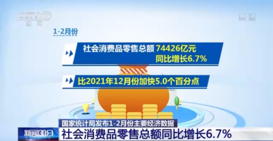 从消费看,市场销售回升,消费升级类商品销售活跃。1—2月份,社会消费品零售总额74426亿元,同比增长6.7%,比2021年12月份加快5.0个百分点。