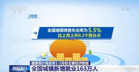 从就业看,1—2月份,全国城镇新增就业163万人。2月份,全国城镇调查失业率为5.5%,比上月上升0.2个百分点,与上年同期持平,就业形势总体稳定,调查失业率基本平稳。