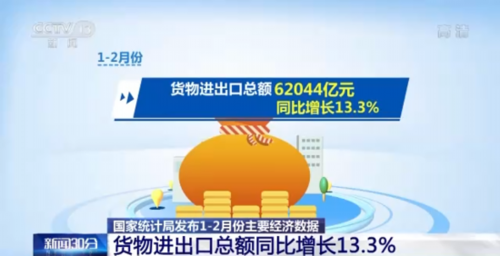 从外贸看,货物进出口较快增长,贸易结构持续改善,1—2月份,货物进出口总额62044亿元,同比增长13.3%。