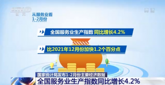 从服务业看,1—2月份,全国服务业生产指数同比增长4.2%,比2021年12月份加快1.2个百分点。服务业持续恢复,现代服务业较快增长。