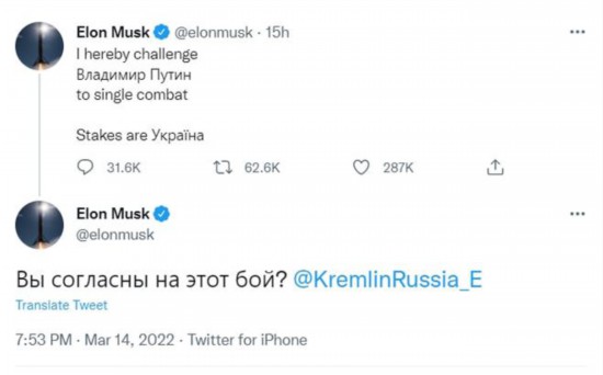 综合俄罗斯《消息报》、俄新社等媒体报道,美国太空探索技术公司(SpaceX)创办人埃隆·马斯克当地时间14日混用英语、俄语和乌克兰语发推,向俄罗斯总统普京喊话称,“我特此挑战弗拉基米尔·普京。要单挑。赌注是乌克兰。”