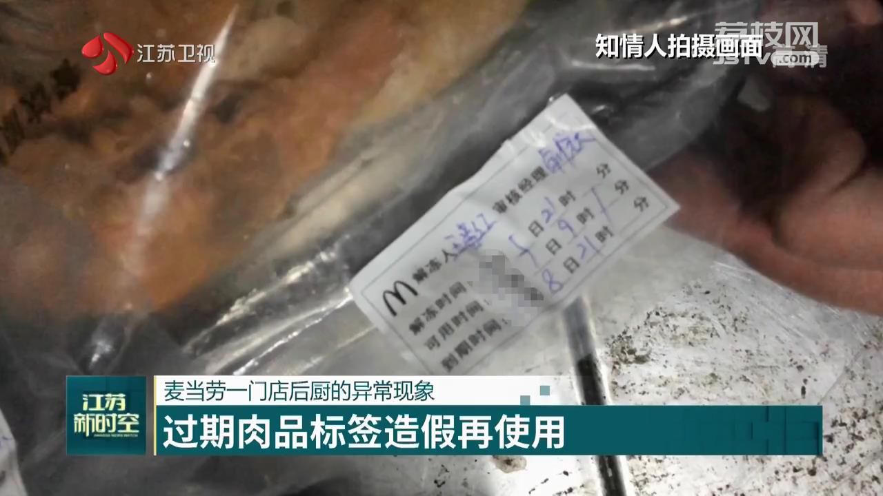 知情人说,他拍到的部分肉品是5日晚9点解冻,根据麦当劳公司的规定,7日早9点可以使用,8日晚9点到期。可直到9日晚7点,这部分肉还在门店后场使用着,临近下晚班时,对于部分已经到期没有用完的肉,工作人员开始换标签。