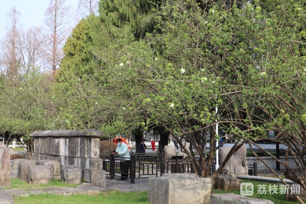 平时那些六百多年明故宫残存的石础静静的躺在公园里,很少有人会注意它。如今,石础间的绣球花开了,白色的青色的花球一朵朵、一簇簇,石础似乎成了这些花球的基座,顷刻间这里成为午朝门公园最吸引人眼球的地方。“往年都是四月初开始开花,到四月中旬盛花期,今年才三月中旬,就有花开了!”拍客张先生介绍说。