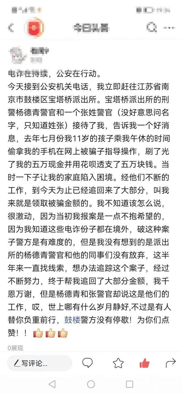 在得知款项被追回的消息后,陆女士一家激动不已。" 被骗的十万块,有一半是孩子网贷透支的,一下子让我家陷入了困境 …… 派出所的杨警官和他的同事们没有放弃!"
