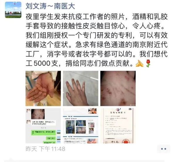“夜里学生发来抗疫工作者的照片,酒精和乳胶手套导致的接触性皮炎触目惊心,令人心疼。我们组刚授权一个专门研发的专利,可以有效缓解这个症状......”