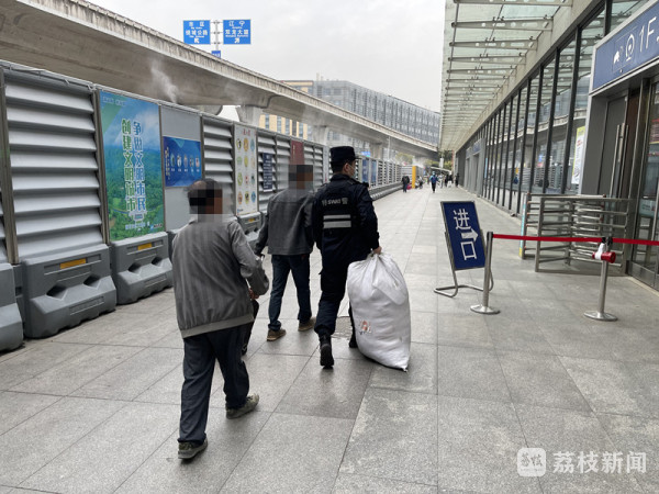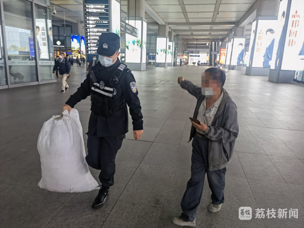 3月14日下午5点左右,南京特警支队武装巡逻一大队民警在南京南站快反点执勤时,发现一名身形消瘦的老人扛着一大麻袋行李站在广场上徘徊,神情焦虑。民警立即上前询问情况。老人已经快80岁,想要坐大巴车回家,却发现身份证丢失了,也不记得身份证号码。售票处因为他的身份信息不全,也无法帮他办理临时身份证。