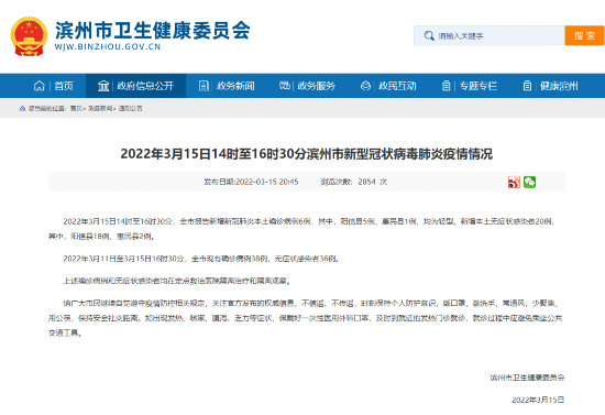 2022年3月11日至3月15日16时30分,滨州全市现有确诊病例38例,无症状感染者36例。