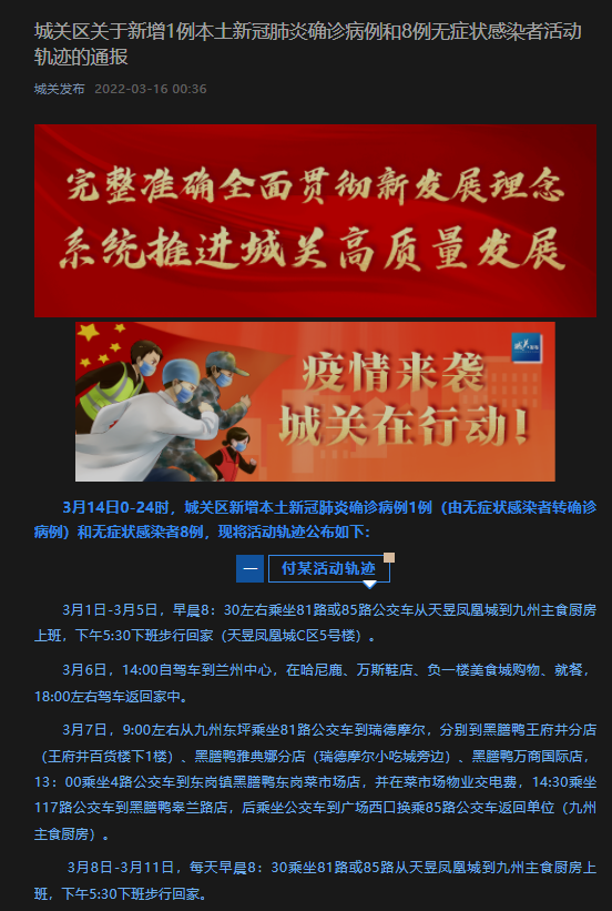 荔枝新闻讯 据“城关发布”微信号消息,3月14日0-24时,城关区新增本土新冠肺炎确诊病例1例(由无症状感染者转确诊病例)和无症状感染者8例,现将活动轨迹公布如下: