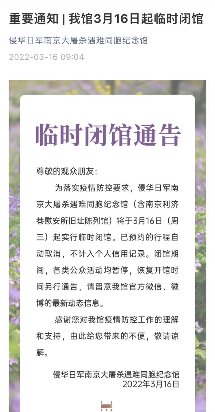 荔枝新闻讯 据“侵华日军南京大屠杀遇难同胞纪念馆”微信号发布的通告,为落实疫情防控要求,该馆(含南京利济巷慰安所旧址陈列馆)3月16日起实行临时闭馆。