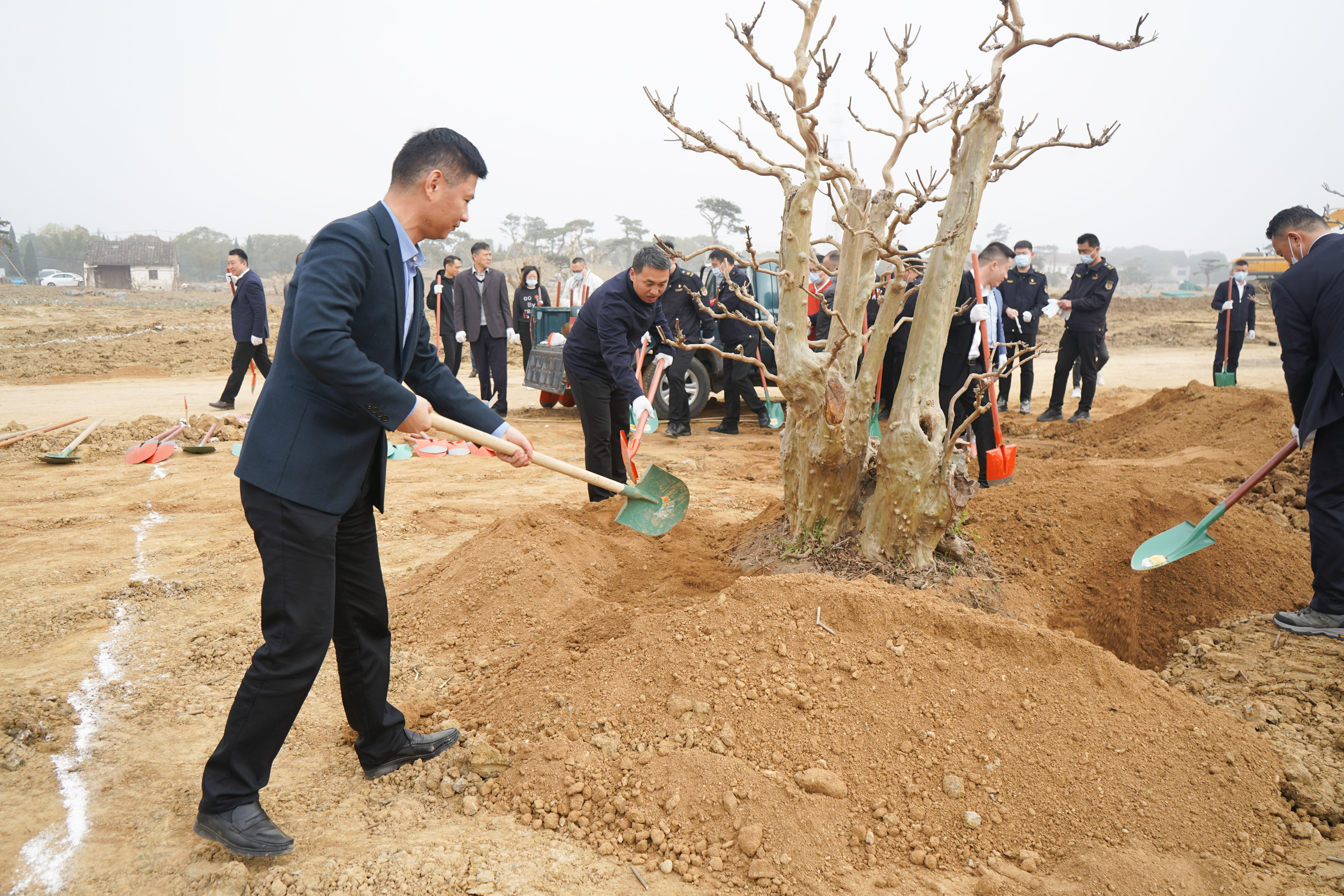 植树点位于北雪泾寺西南侧的渭塘生态文化EOD项目区域。这里将结合当地公共文化设施建设,围绕生态文化,高水平打造成江南独具特色的生态文化园景区。植树现场,大家热情高涨,干劲十足,有的挖坑,有的扶树,有的填土,有的浇水……齐心协力,配合默契,整个植树场面热闹而有序,处处传递着春的生机与活力。