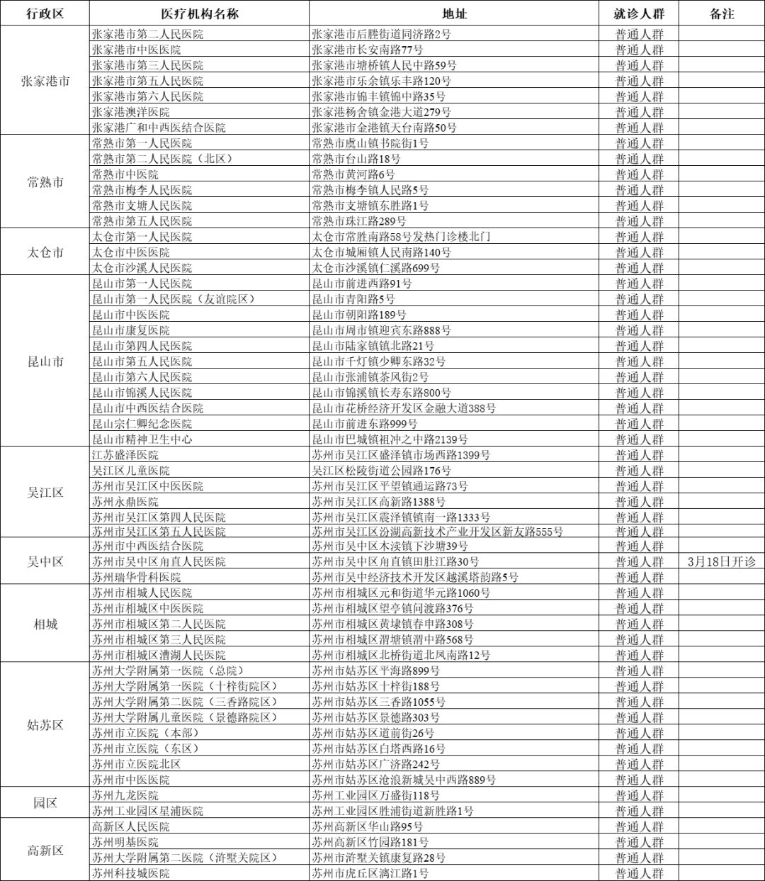 苏州市开设发热门诊的医疗机构名单