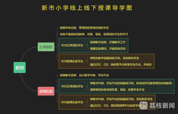 由于一定数量的老师居住在“封控区”“管控区”,无法按时到岗上课,学校统筹安排其他班级教师临时代课,或帮助班级学生开展线上教学。部分学校还设计了“线上线下授课导学图”,保障学校教育教学工作井然有序。