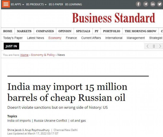对于印度表态购买俄罗斯石油一事,美国白宫新闻秘书普萨基在3月15日的记者会上声称,虽然印度此举并不违反美国对俄制裁,但希望印度想清楚自己在历史上的站位。