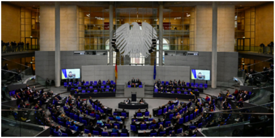 3月17日在德国柏林,泽连斯基出现在德联邦议院的两个屏幕上,德议员和政府官员正通过视频观看泽连斯基讲话