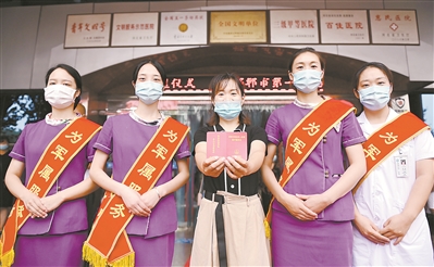 在医疗服务队队员陪伴下,军属自豪地展示现役军人家属医疗服务证。 李金花摄