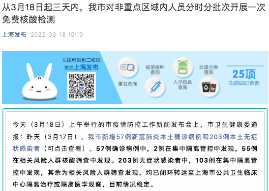 前两天,我们在全市的重点区域内开展了切块式、网格化的核酸筛查。今天发布的确诊病例和无症状感染者人数比较多,大部分是从这一次重点区域筛查中发现,说明我们的筛查是非常及时、必要和紧迫的。从今天起至20日的三天内,我们将针对非重点区域内人员,以街镇为单位,分时、分批次开展一次免费核酸检测。已有3天(18日-20日)内一次核酸检测阴性证明、已在闭环管理的高风险岗位、已有例行加密核酸筛查工作机制的人员,不在此列。我想说明一下,非重点区域开展的筛查没有要求管控,希望大家配合好社区的工作。
