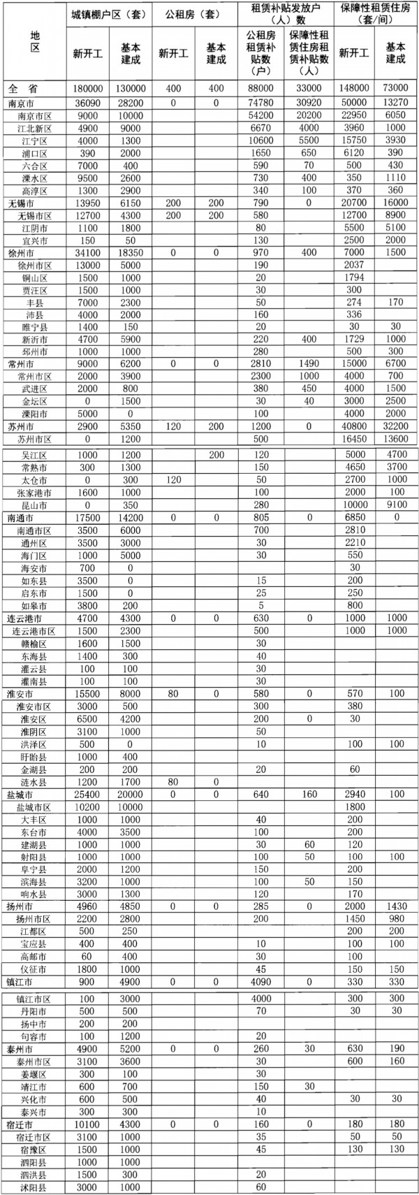 《通知》明确,2022年江苏新开工城镇棚户区18万套、基本建成13万套,新开工(筹集)保障性租赁住房14.8万套(间)、基本建成7.3万套(间),新开工公共租赁住房400套、基本建成400套,发放公租房租赁补贴8.82万户、发放保障性租赁住房租赁补贴3.36万人。
