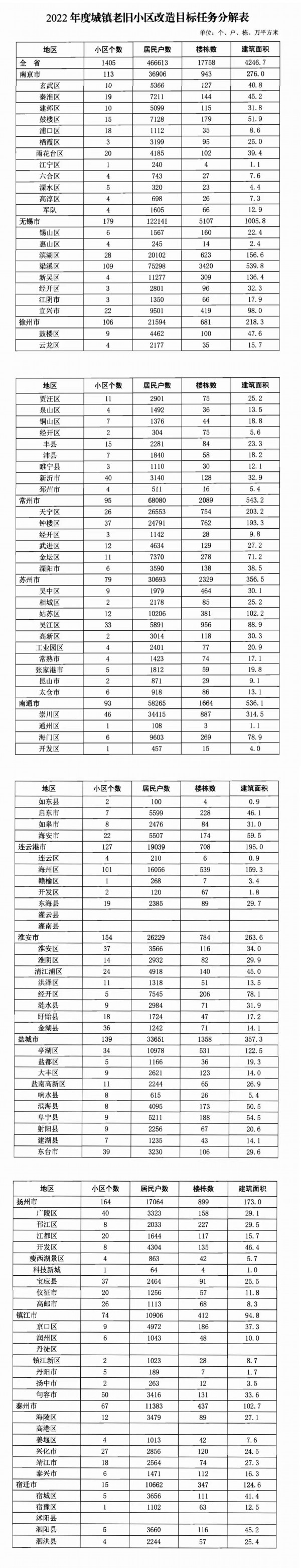 《通知》对全省老旧小区改造进行了细化分解。新江苏记者关注到,此次共有7个设区市老旧小区改造数过百,分别为:无锡市179个,南京市113个,徐州市106个,连云港市127个,淮安市154个,盐城市139个,扬州市164个。宿迁市改造小区数最少,为15个。其余5个设区市改造情况分别为:常州市改造95个,南通市改造93个,苏州市改造79个,镇江市改造74个,泰州市改造67个。