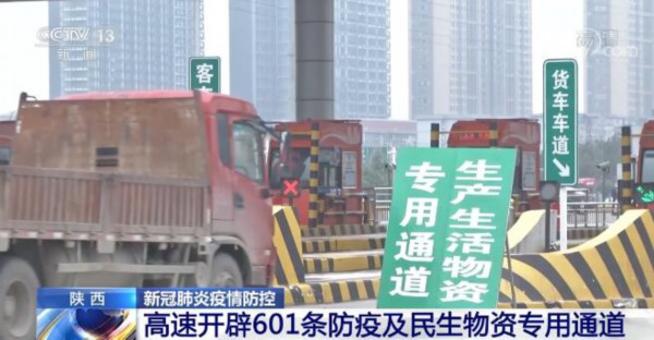 央视网消息:面对疫情,陕西在各高速公路收费站开通601条防疫物资、鲜活农产品及生产生活物资专用绿色通道,确保省内外拉运物资的车辆快速、高效通行,助力各地疫情防控和民生保障。