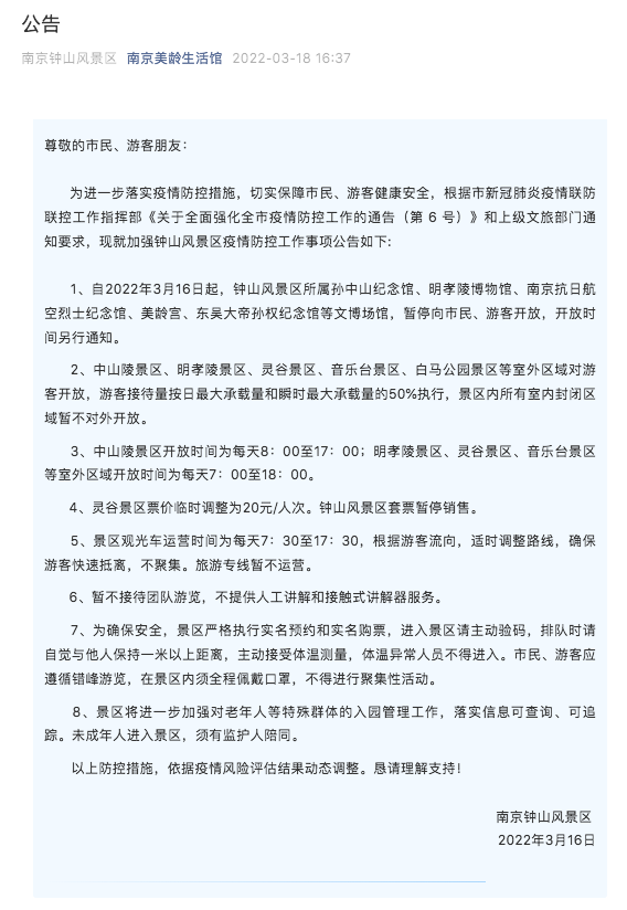 荔枝新闻讯 根据钟山风景区微信公众号消息,为进一步落实疫情防控措施,切实保障市民、游客健康安全,根据市新冠肺炎疫情联防联控工作指挥部《关于全面强化全市疫情防控工作的通告(第 6 号)》和上级文旅部门通知要求,现就加强钟山风景区疫情防控工作事项公告如下: