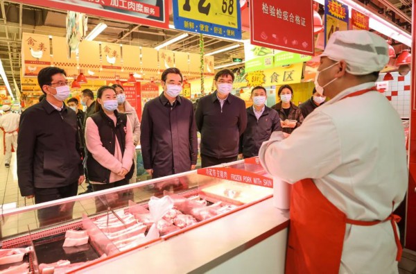 在盱眙县大润发超市,史志军边走边看边问,检查进出人员有没有规范佩戴口罩、有没有扫码测温等情况。