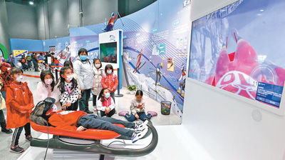 北京冬奥会和冬残奥会期间,在中国科技馆举行的冬梦飞扬——“科技冬奥”主题展览通过新技术手段,向参观者介绍科技冬奥的创新魅力。图为小朋友通过VR(虚拟现实)设备体验雪橇运动。 陈晓根摄(影像中国)