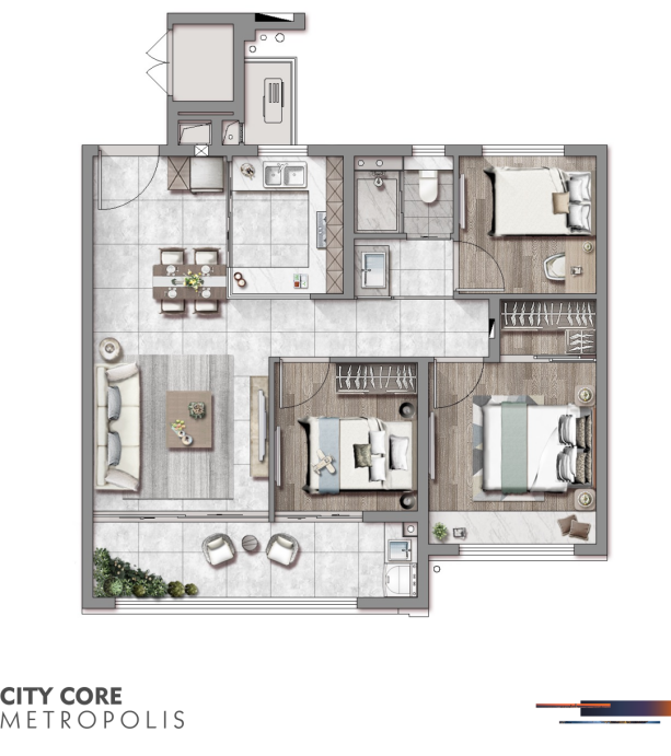 建面约107㎡三房两卫,动静分区,客餐厅阳台连成一线,打造“无界厨房”带有西式岛台,双开间大阳台。主卧及主卧自带的卫生间均设计有飘窗,北侧次卧带飘窗,增加了空间利用率。