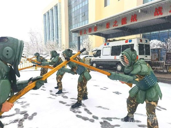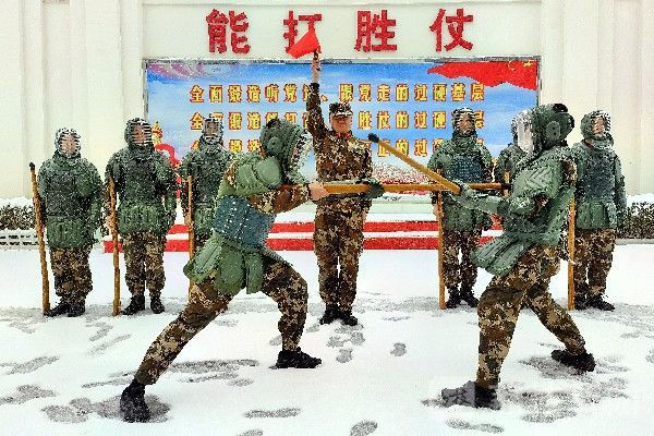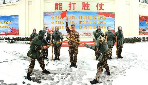 3月18日下午,京津地区突降大雪,气温骤降,武警天津总队执勤四支队利用极端天候练兵条件,开展刺杀对抗训练。