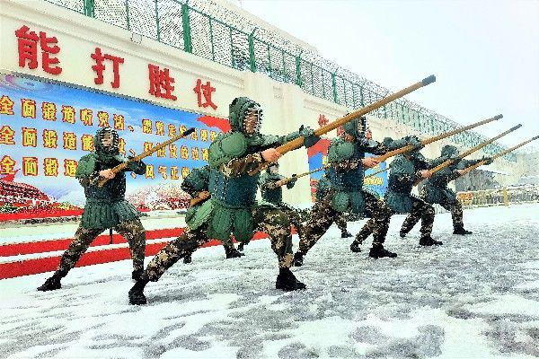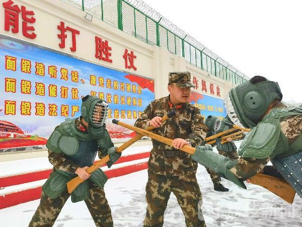 训练场上,官兵不畏严寒在雪中进行对抗训练,通过展开刺杀训练,让官兵练就一招制敌的本领,锤炼军人血性胆气。
