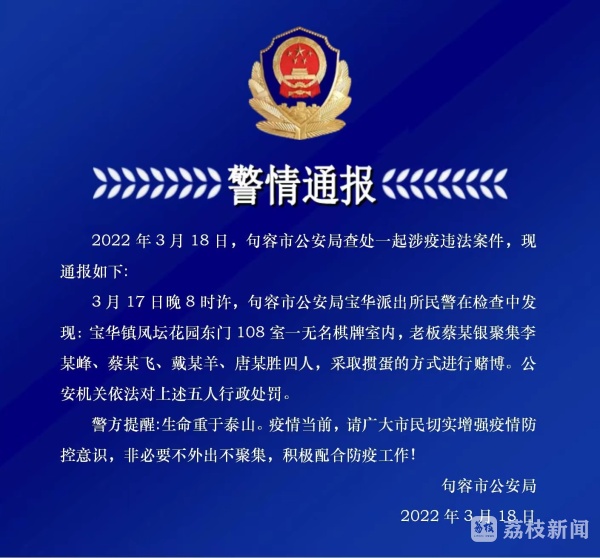2022年3月18日,镇江句容市公安局查处一起涉疫违法案件,现通报如下: