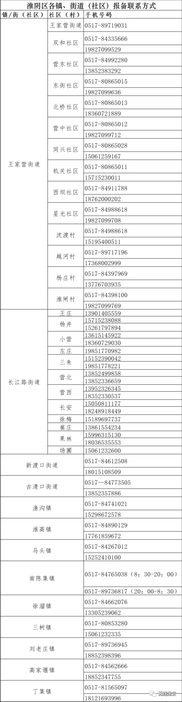 根据淮安市《关于进一步严格做好当前新冠肺炎疫情防控工作的通告》,市外来淮返淮人员,抵淮时须持有48小时内核酸检测阴性证明、健康码绿码,抵淮后立即进行核酸检测,第一时间向所属社区(村)报告。现将淮安各地镇(街道)、社区(村)报备联系电话公布如下。