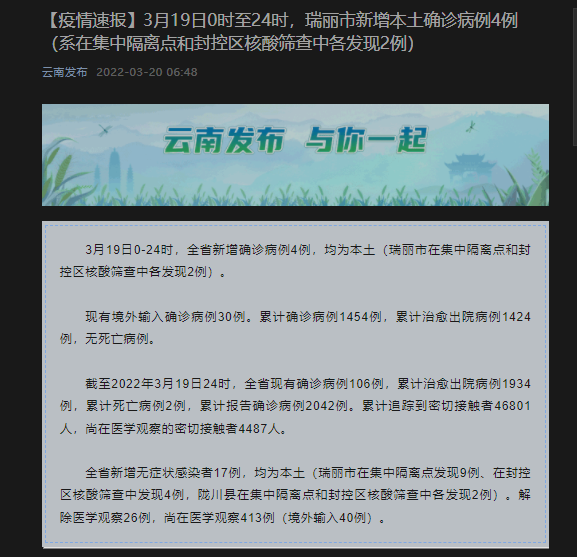 截至2022年3月19日24时,云南全省现有确诊病例106例,累计治愈出院病例1934例,累计死亡病例2例,累计报告确诊病例2042例。累计追踪到密切接触者46801人,尚在医学观察的密切接触者4487人。