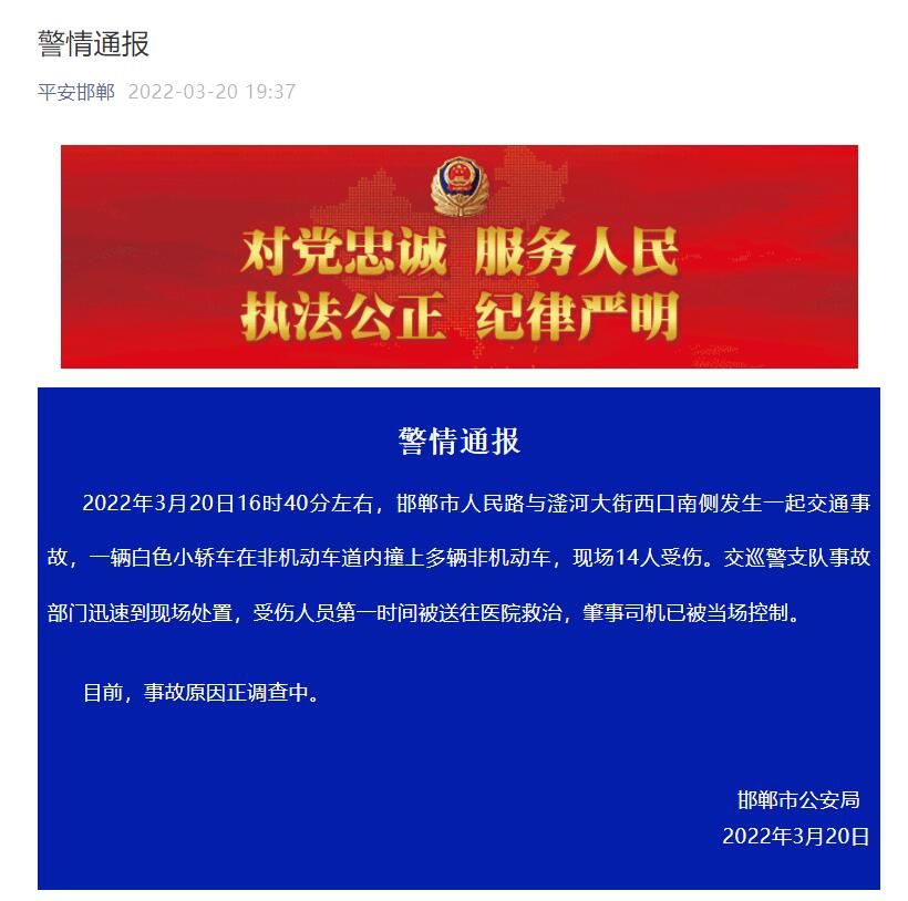 荔枝新闻讯 据河北邯郸市公安局通报,2022年3月20日16时40分左右,邯郸市人民路与滏河大街西口南侧发生一起交通事故,一辆白色小轿车在非机动车道内撞上多辆非机动车,现场14人受伤。交巡警支队事故部门迅速到现场处置,受伤人员第一时间被送往医院救治,肇事司机已被当场控制。