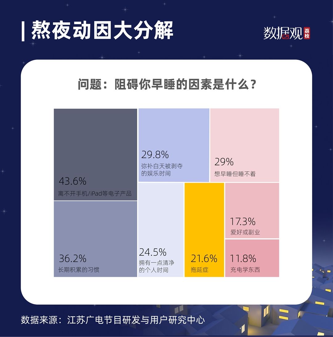 谈到哪些因素导致熬夜晚睡时,54.1%的受访者是习惯性晚睡,包括长期积累成习惯(36.2%)以及到点想睡都睡不着(29%);“自控力不强”是另一大因素,有52.1%的受访者选择这一选项;也有超四成受访者晚睡有报复性因素,想要在晚上找回白天被剥夺的娱乐时间(29.8%)或是需要安静的个人空间(24.5%),众多80后、90后受访者属于此类。