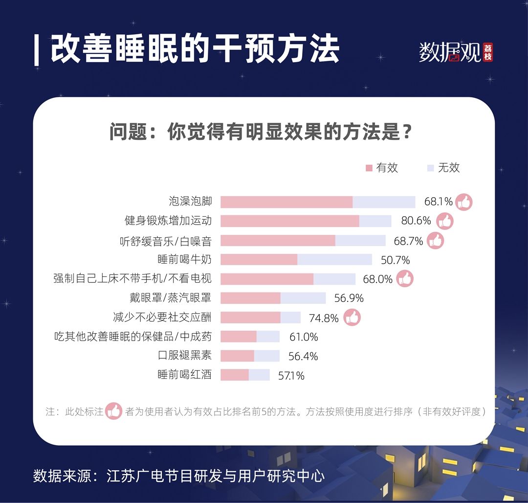对于各类改善睡眠的干预方法,八成亲测者感受到适度的锻炼运动有助于身体更好地进入休息状态,这在所有方法中有效性评价最高。使用较广的几类方法中,听舒缓音乐或白噪音、泡澡泡脚、睡前远离手机的效果评价也相当高,近七成尝试过的人都从中体会到了益处。