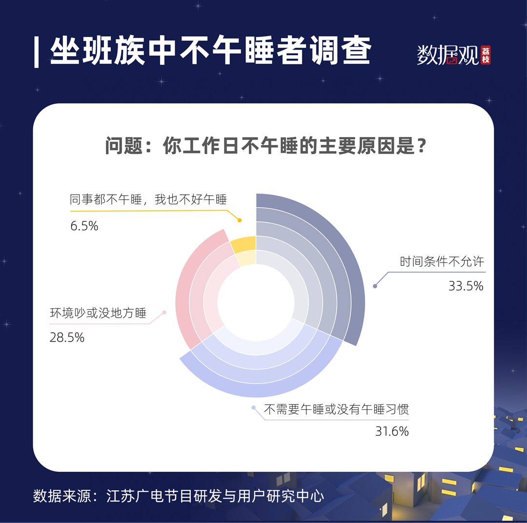 不午睡的坐班族中,近七成人表示并非自己不需要,而是条件不允许:首先是时间问题,33.5%的不午睡坐班族认为午休短、工作忙使得他们没法午睡,80后、90后多属于此类;其次是环境条件,没地方、环境吵;还有一部分是受午睡氛围影响,同事都不午睡,自己也不好意思午睡。