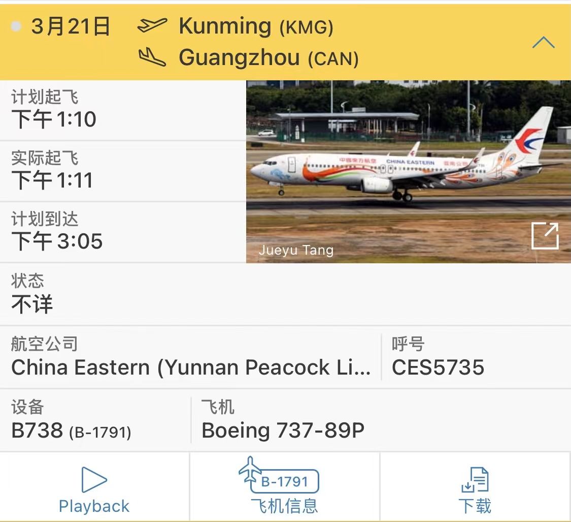 荔枝新闻了解到,发生事故的飞机正在执行MU5735航班,从昆明飞往广州,原定计划在21日13点10分起飞,并于15点05分抵达广州。