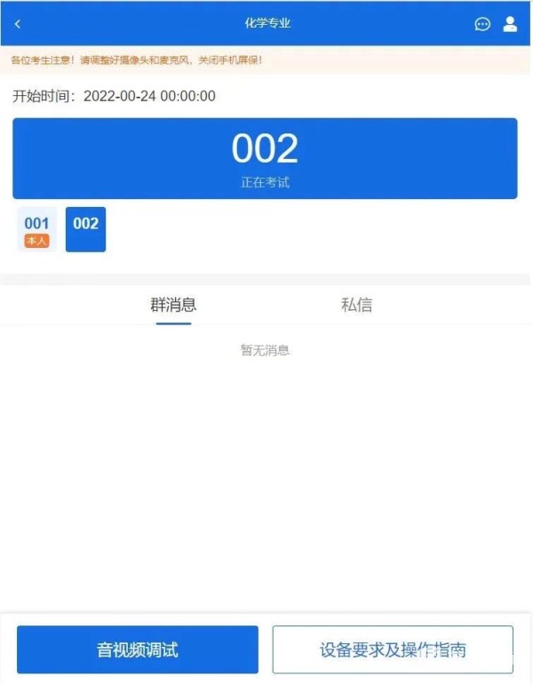 考生进行考场实人验证,进入考场候考页面,可以查看考试开始时间、考试顺序、考官发送的群消息和私信等。