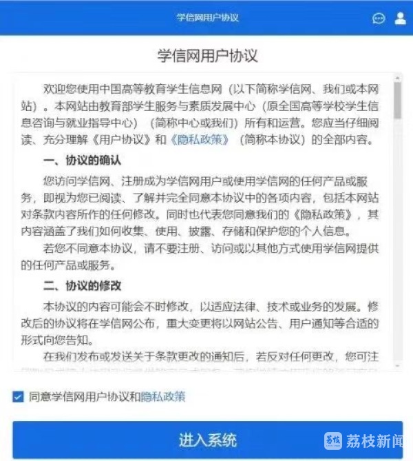 考生进入系统页面后,需认真仔细阅读学信网用户协议和隐私政策,勾选“同意学信网用户协议和隐私政策”方可进入系统。