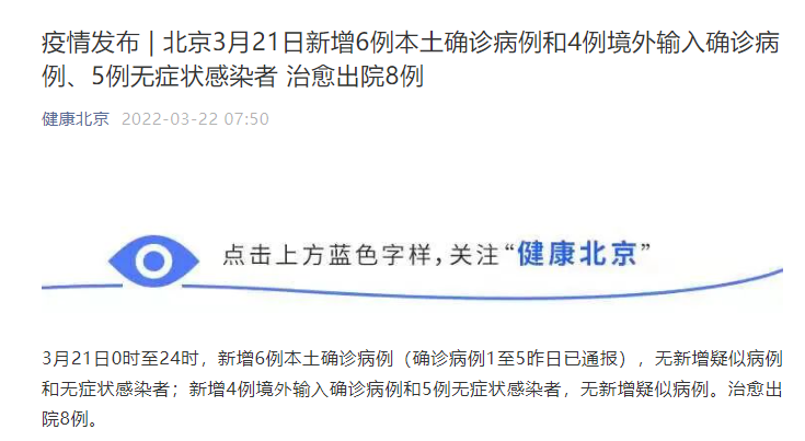 荔枝新闻讯 据健康北京微信公众号消息,3月21日0时至24时,北京新增6例本土确诊病例(确诊病例1至5昨日已通报),无新增疑似病例和无症状感染者;新增4例境外输入确诊病例和5例无症状感染者,无新增疑似病例。治愈出院8例。