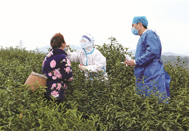 在茶园,记者看到,采茶工均佩戴口罩,自觉分散开来进行采摘。为了不耽误工人们采茶,医务人员身穿防护服,艰难地在青翠的茶园间穿梭,为工人们就地采样。