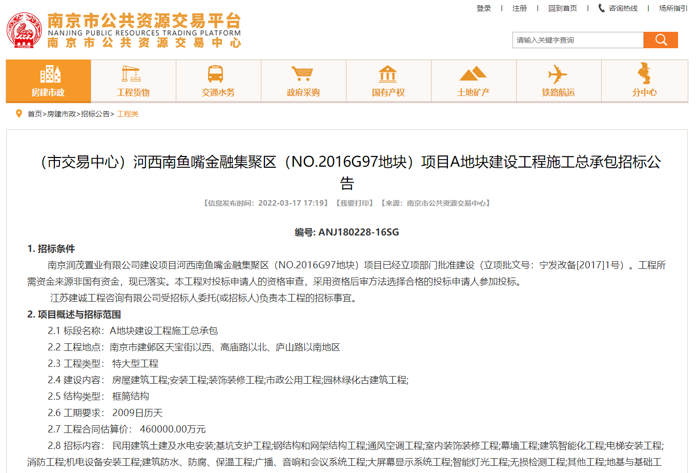 近日,南京市公共资源交易中心发布了《河西南鱼嘴金融集聚区(NO.2016G97地块)项目A地块建设工程施工总承包招标公告》,据公告显示,鱼嘴G97项目A地块工程估算价46亿,建筑高度498.8米,建筑层数为89层(地上85层,地下4层),单体最大建筑面积约23.1万㎡。工期要求2009日历天,也就是说,河西第一高楼预计将在2028年建成面世。