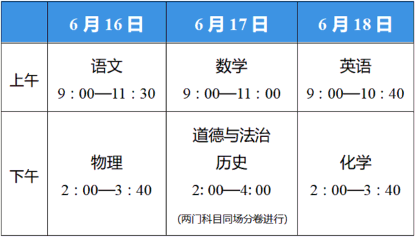 考试用时:语文150分钟、数学120分钟、英语100分钟、物理100分钟、化学100分钟,道德与法治和历史共120分钟。