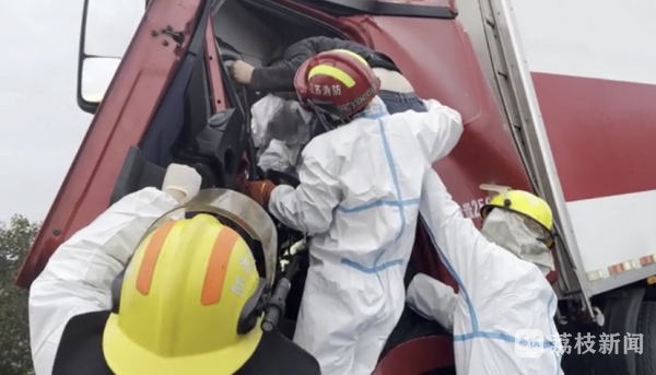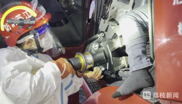消防救援人员到场后发现,半挂车的车头已发生严重变形,前挡风玻璃完全破碎,驾驶员腿部受伤,被死死地卡在方向盘下,无法动弹。消防救援人员首先利用液压顶杆扩大驾驶员座椅的空间,随后使用液压扩张器进行扩张,一名消防救援人员进入驾驶室继续对方向盘下方的部分进行扩张。