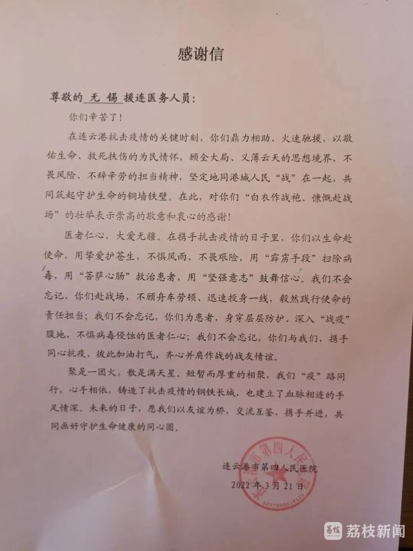 从太湖之滨来到港城,队员们用自己的实际行动,在抗疫一线展现了“无锡作为”和“无锡力量”。连云港市第四人民医院还为无锡援连医疗队写了一封感谢信。