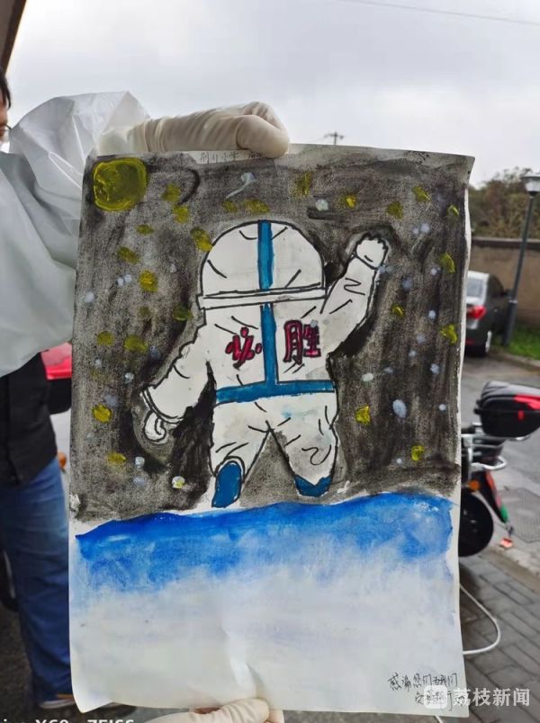封控区的住户们都很配合我的工作,他们得知我是南通来支援的护士,自发地对我说“感谢”“辛苦了”之类的话语,让我在这初春的寒意里感到了浓浓的温暖。尤其让我感动的是一家住户,当我进门后一个七八岁左右的小女孩蹦蹦跳跳地来到我面前,她举着一幅画说:“阿姨,这个给你,谢谢你为我们采集核酸,你辛苦了!”画上是一个穿着防护服的医护人员的背影,防护服上写着“必胜”两个字,画上有小女孩的名字和学校,右下角有一句话“感谢您们为我们负重前行”。看到这,我的眼泪在眼眶里打转,但我还要执行我的任务,我不能让眼泪流下来。