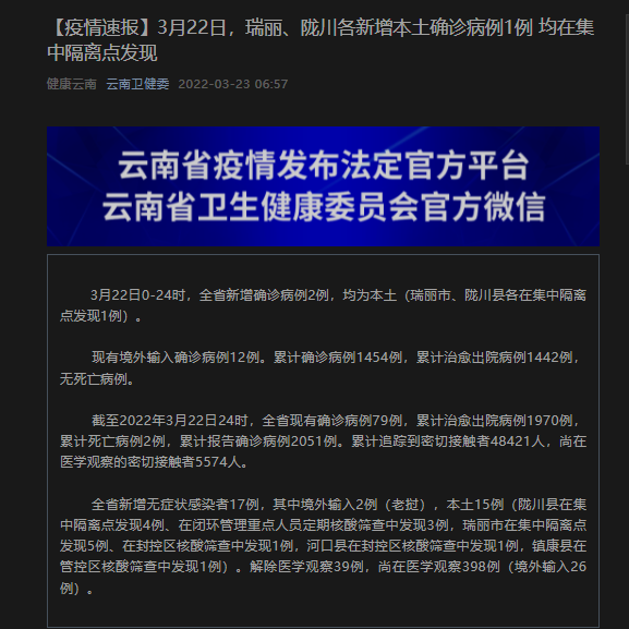 荔枝新闻讯 据“云南卫健委”微信号消息,3月22日0-24时,全省新增确诊病例2例,均为本土(瑞丽市、陇川县各在集中隔离点发现1例)。