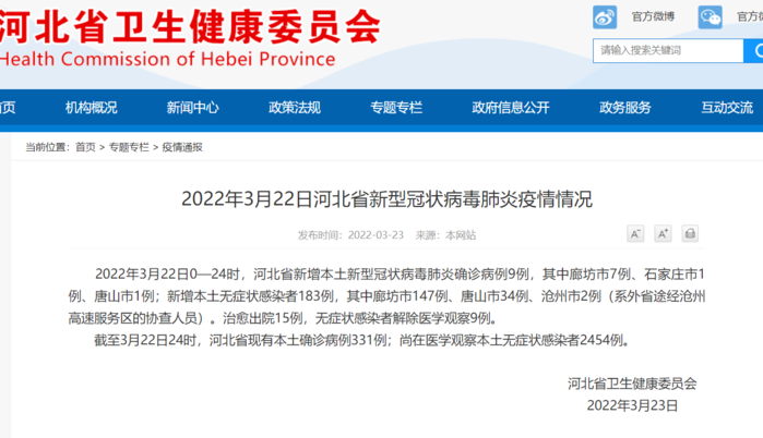 截至3月22日24时,河北省现有本土确诊病例331例;尚在医学观察本土无症状感染者2454例。
