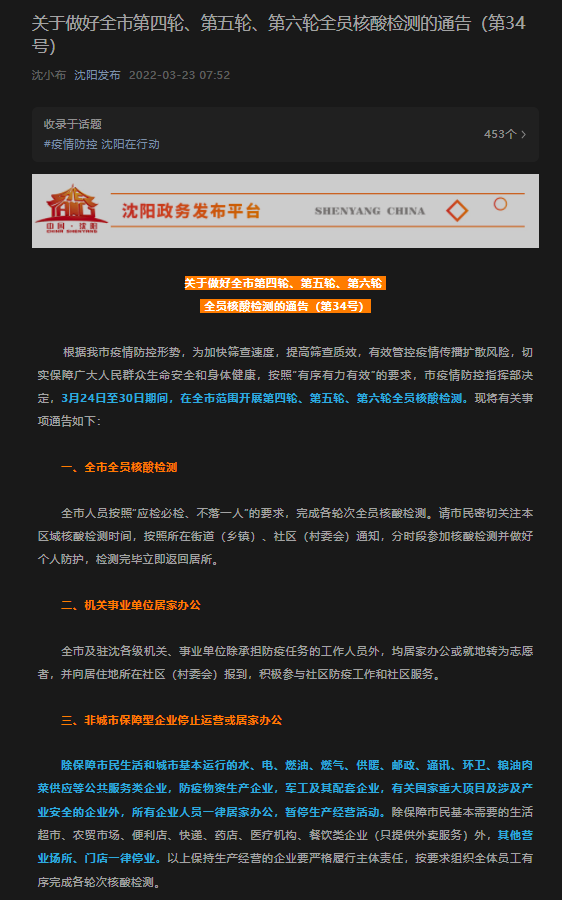 全市及驻沈各级机关、事业单位除承担防疫任务的工作人员外,均居家办公或就地转为志愿者,并向居住地所在社区(村委会)报到,积极参与社区防疫工作和社区服务。